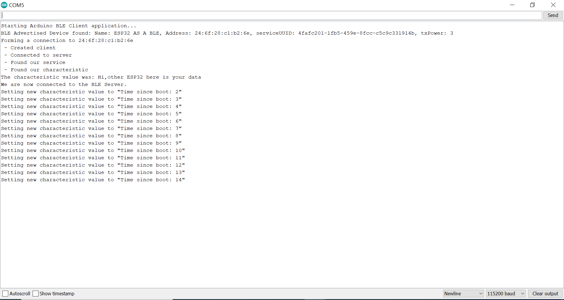 This code is relying on some user-defined functions. We defined Characteristic and service UUID at the start of the code. Objects of BLERemoteCharacteristic, BLEAdvertisedDevice classes are made at the start and function connectToServer() is used to connect to the server(other esp32). It finally fetches all the data provided by server using variables of characteristic and service . The serial monitor will display the following values as: