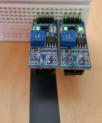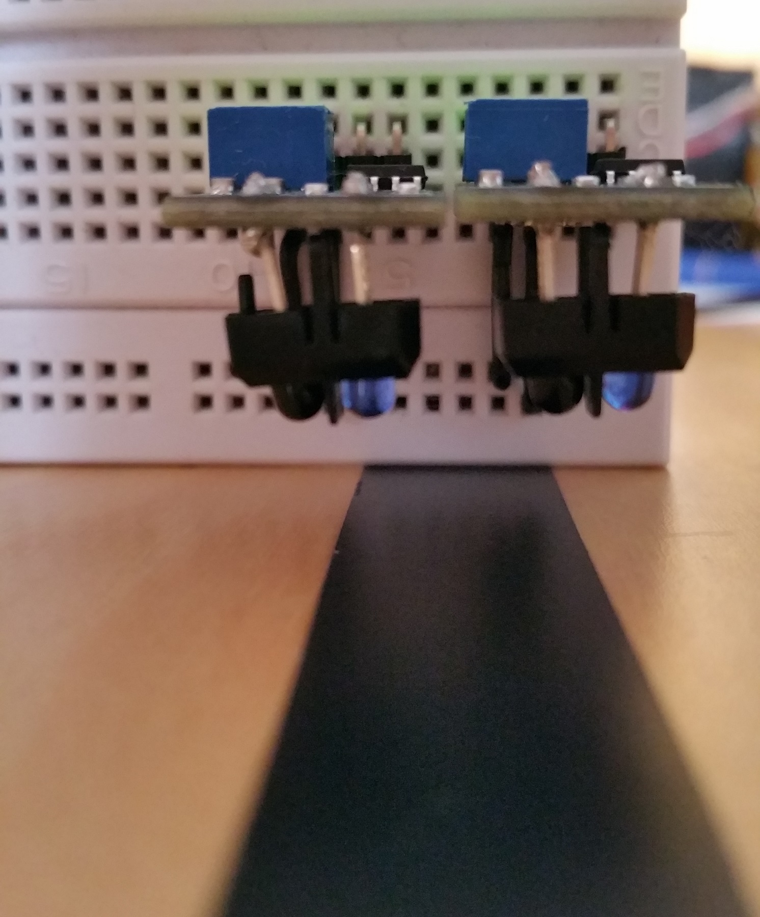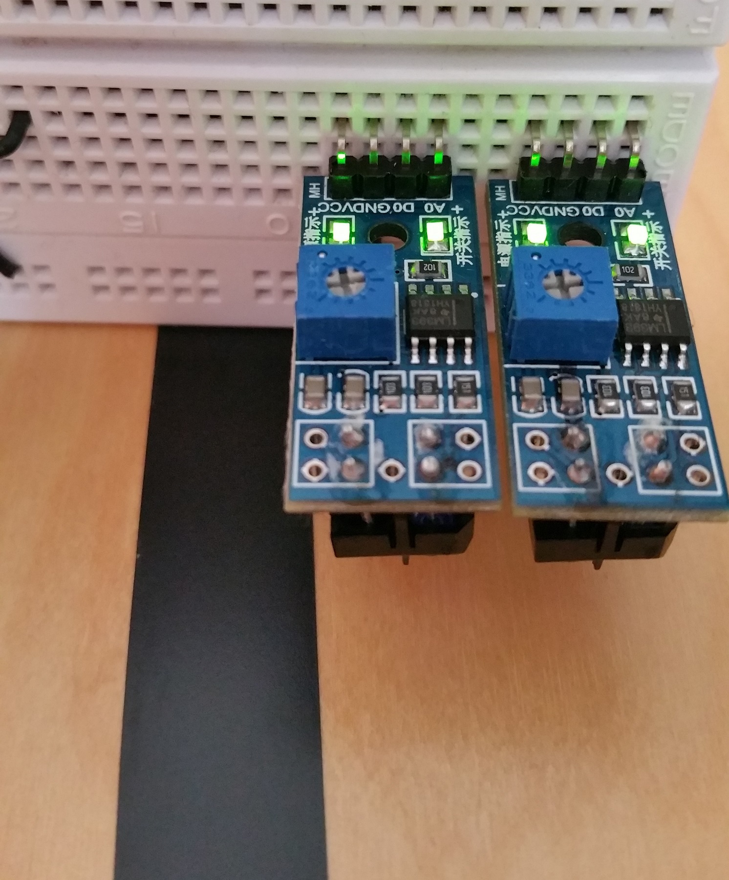 One of the two IR LEDs sends an invisible (infrared) signal. If this is now absorbed, the sensor is in all probability on a black line. Since the same effect is achieved as soon as the module is too far away from a surface, it should be ensured that the distance to the floor is approx. 1 to 1.5cm.