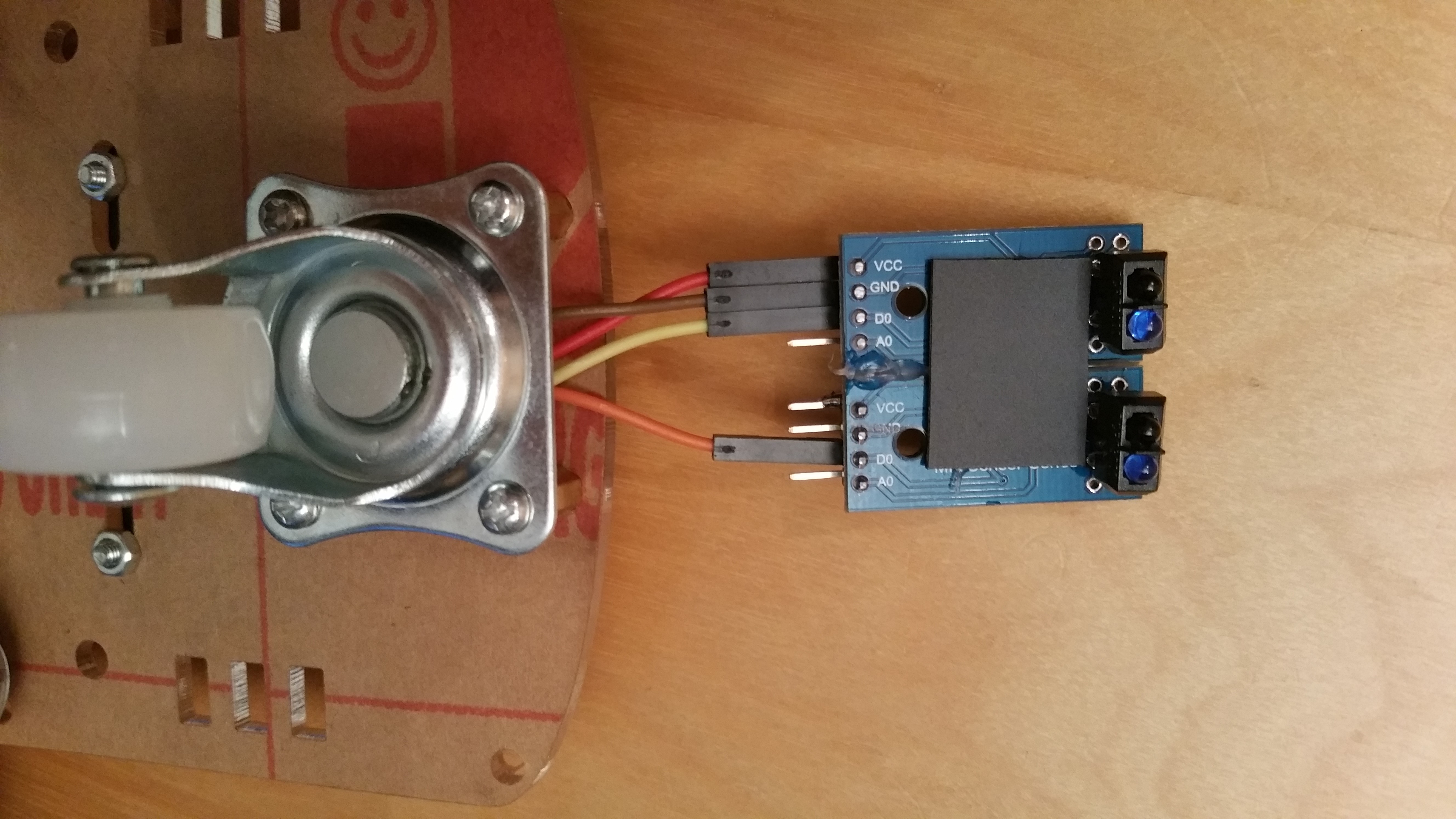 Before we attach the sensors, it is advisable to connect them: To do this, I attached both to each other on the sides with a little hot glue. After this has dried, I soldered the two VCC and GND pins to each other with a wire so that fewer cables are required. After attaching the jumper cables, I glued the assembled modules to the front wheel of the body with more hot glue. It is important that the distance to the ground is not too great. You should test the perfect height before attaching it (I fit exactly one finger underneath).