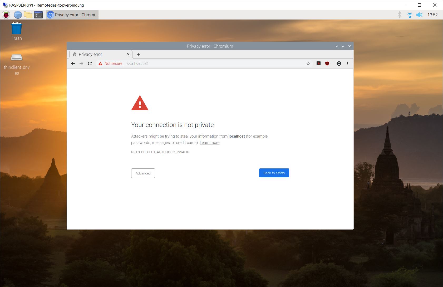 There is a warning that the (self-signed) certificate is invalid, but we can ignore it (Advanced -> Continue):
