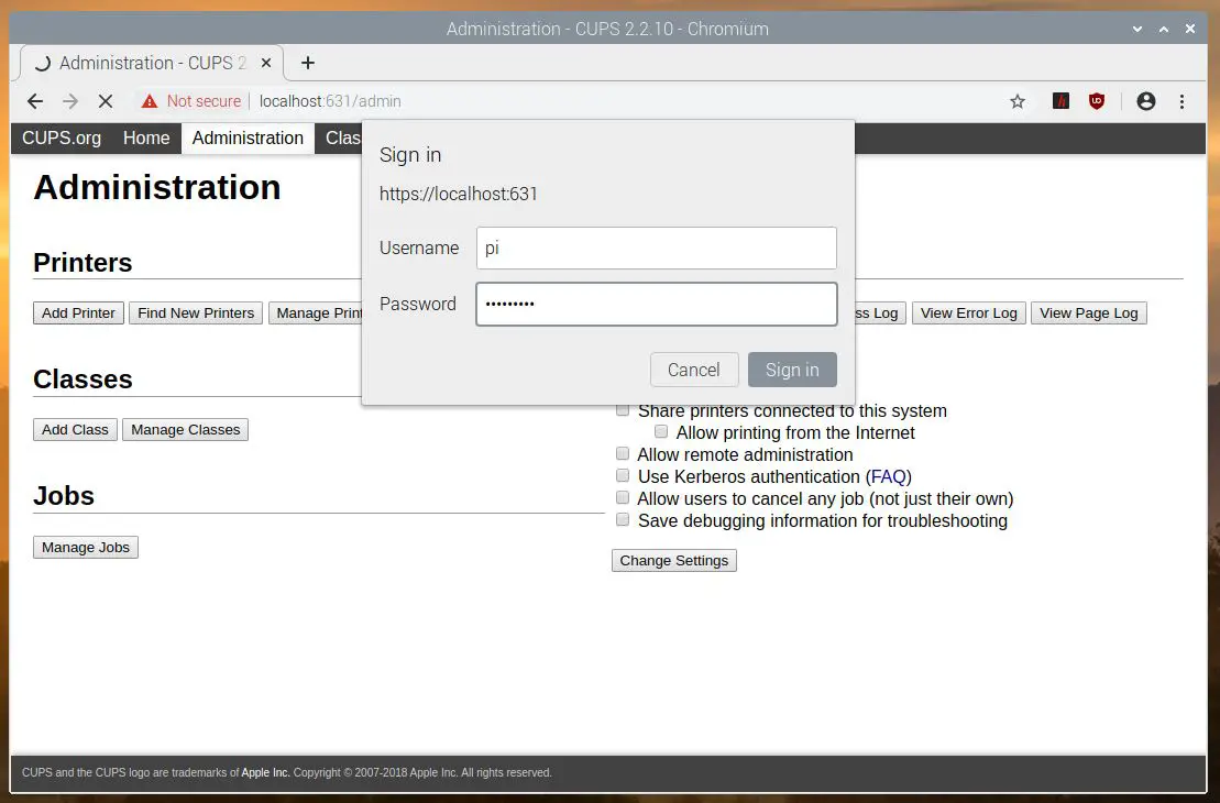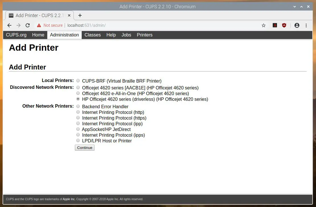 In order to be able to recognize our printer, we use the CUPS software from Apple, which was developed for MacOS and other Unix systems. Drivers for all possible printers are available here and the entire configuration, integration, etc. is managed by them.