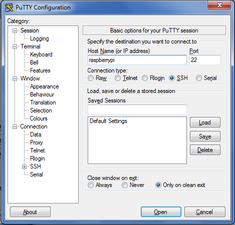 So let’s begin. On Windows computers you need the program PuTTY. You doesn’t have to install it – Putty can be used without installation by opening just the putty.exe file. Then you will see a user interface like this where you enter the host “raspberrypi“: