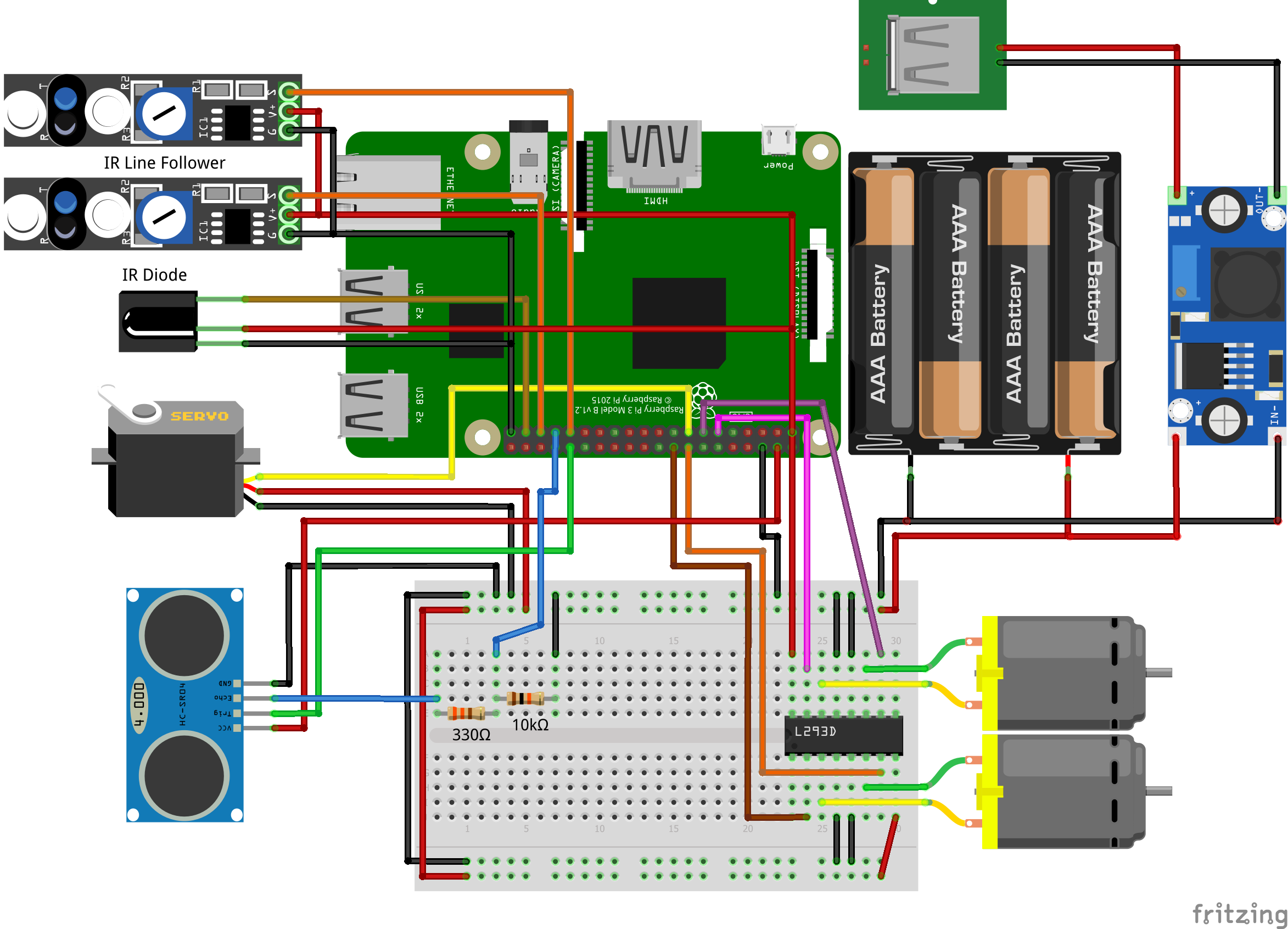 The ultrasound module is supplied with power via the 5V of the Pi, whereas the servo motor should be connected via the batteries. Ground of the Raspberry Pi and the batteries are (as before) still connected to each other.