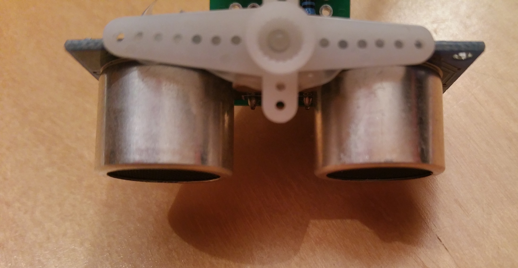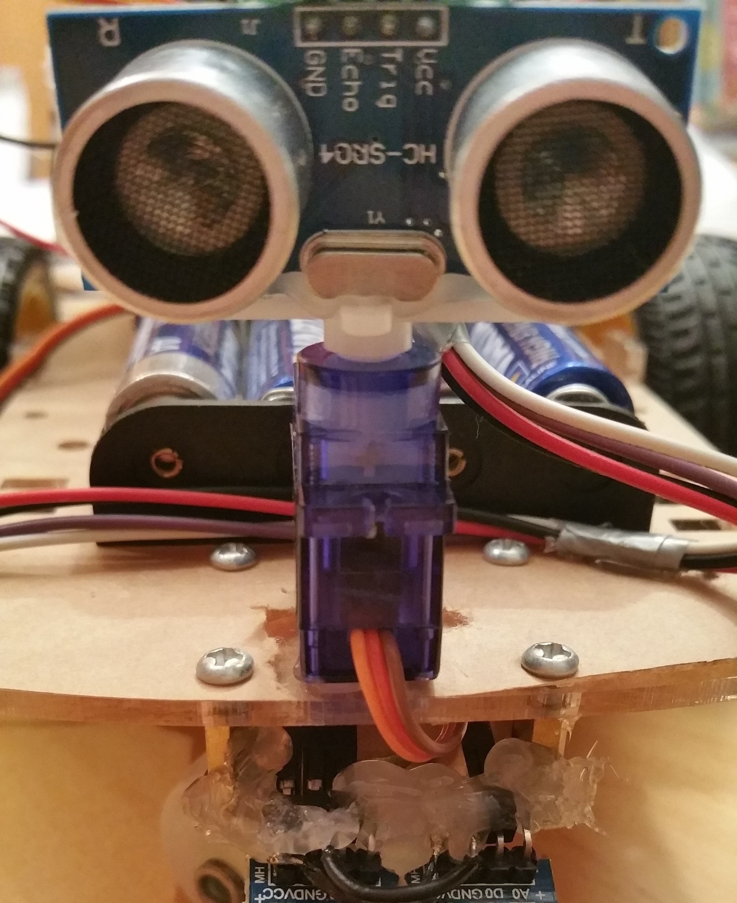 Then I took one of the attachments of the servo motor and attached the HC-SR04 module to it with hot glue (see pictures). The attachment can also be easily attached to the motor and removed again. You can run the cables of the servo on the lower side of the body to the Pi (there is a hole in the middle). I glued the jumper cables from the ultrasonic sensor together and fixed them in one place with a little space. However, you should wait until we test the functionality and thus find the best position for the cables.