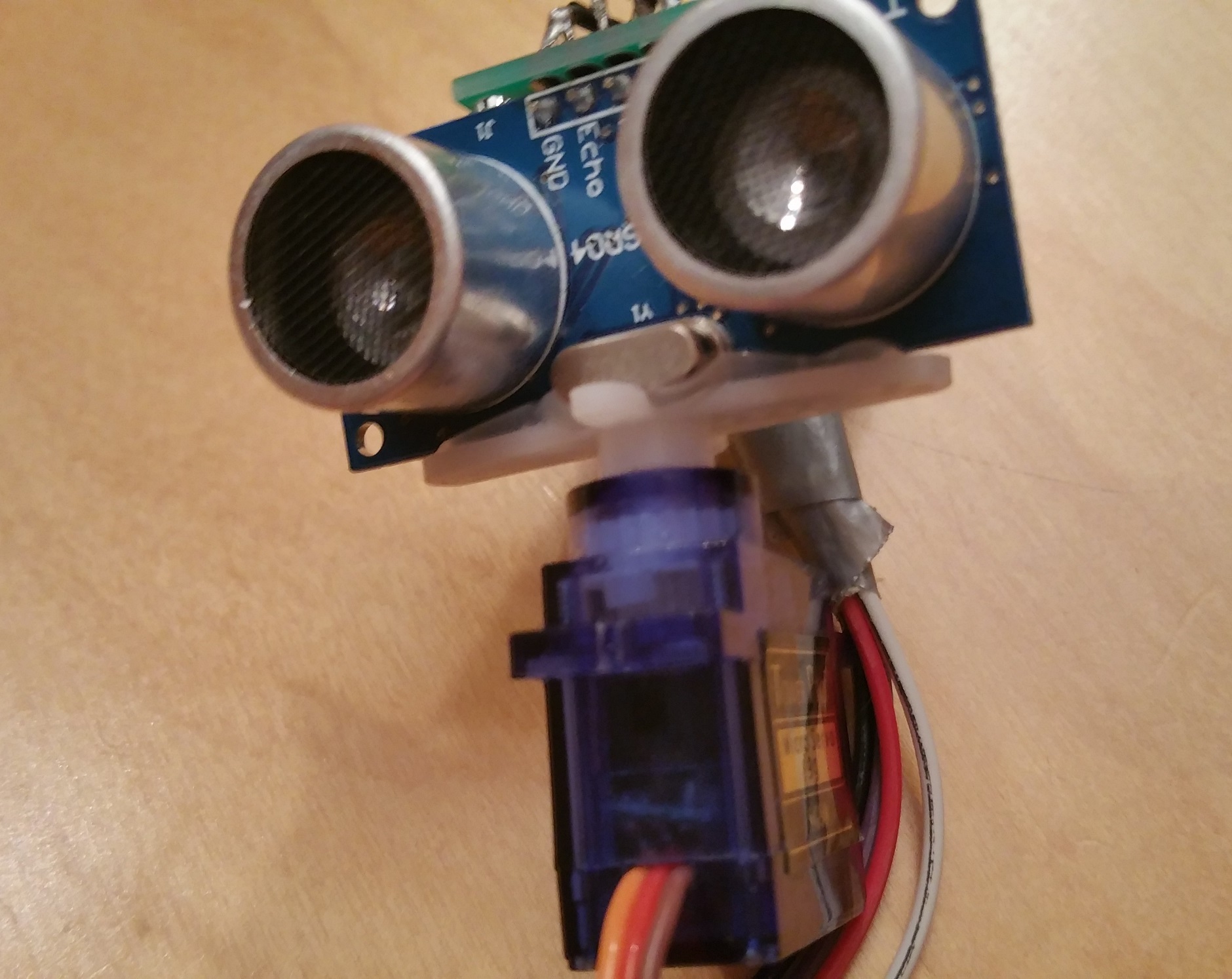 We use a servo motor and an ultrasonic sensor with which we measure the distance. Then we expand the previous code and let the robot go to where there is the most space.