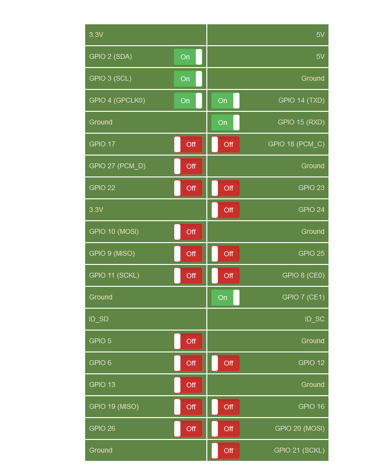 Back in the web browser, you can see the user interface for controlling the GPIOs (no port required). For this, it must be said that the GPIOs are initially displayed as “OFF”, even if another application has previously connected one of the pins. This is because the library unfortunately can not read the output state of the GPIOs. Although you could start the web app all GPIOs to the low level, but I have decided to not do that. If this bothers you, you are free to adjust it.