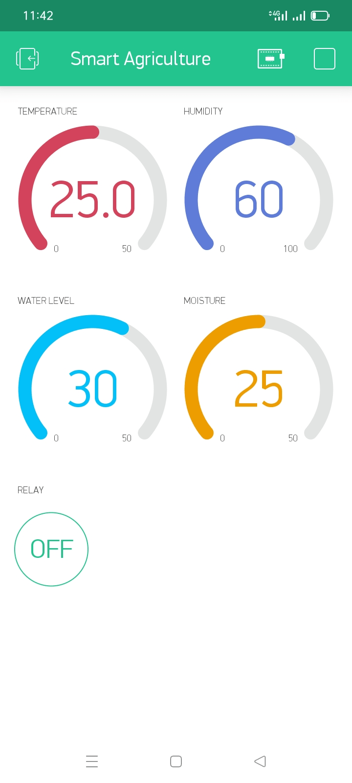 Virtual Write is a method of Blynk Library that helps us to read values from the virtual pins that we will configure when setting up our blynk app. Blynk timer object is used to send the values of temperature and humidity every two seconds and every five sends for water and soil moisture levels. Then these values are updated in the gauges of our app.